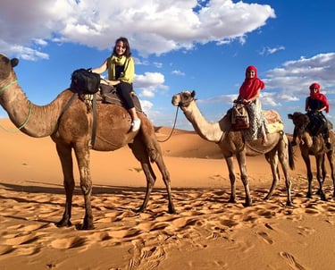 Am Nachmittag erreichst du die goldenen Dünen des Erg Chebbi in Merzouga. Jetzt beginnt dein Sahara-Abenteuer: Auf dem Rücken eines Kamels reitest du zum Herz der Wüste, während die untergehende Sonne den Himmel in magische Farben taucht.